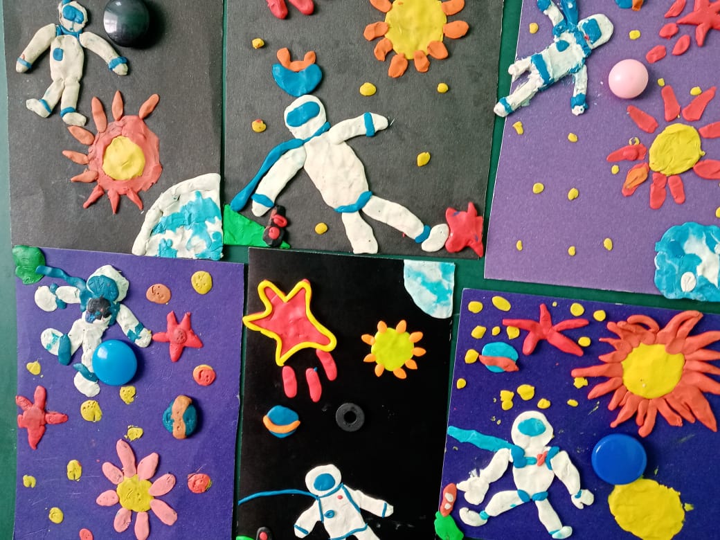 Ко дню космонавтики в начальных классах оформили выставки детских рисунков и поделок «Космическое пространство», «Разные планеты».