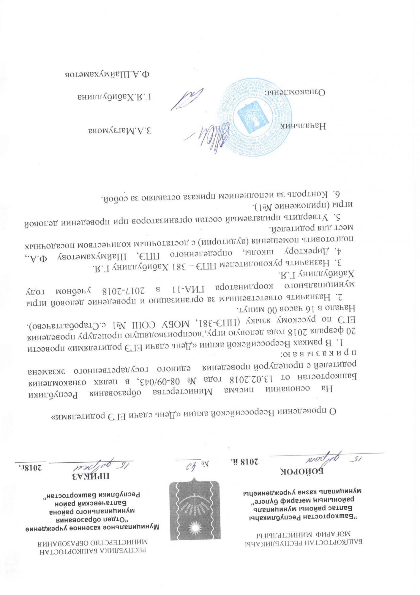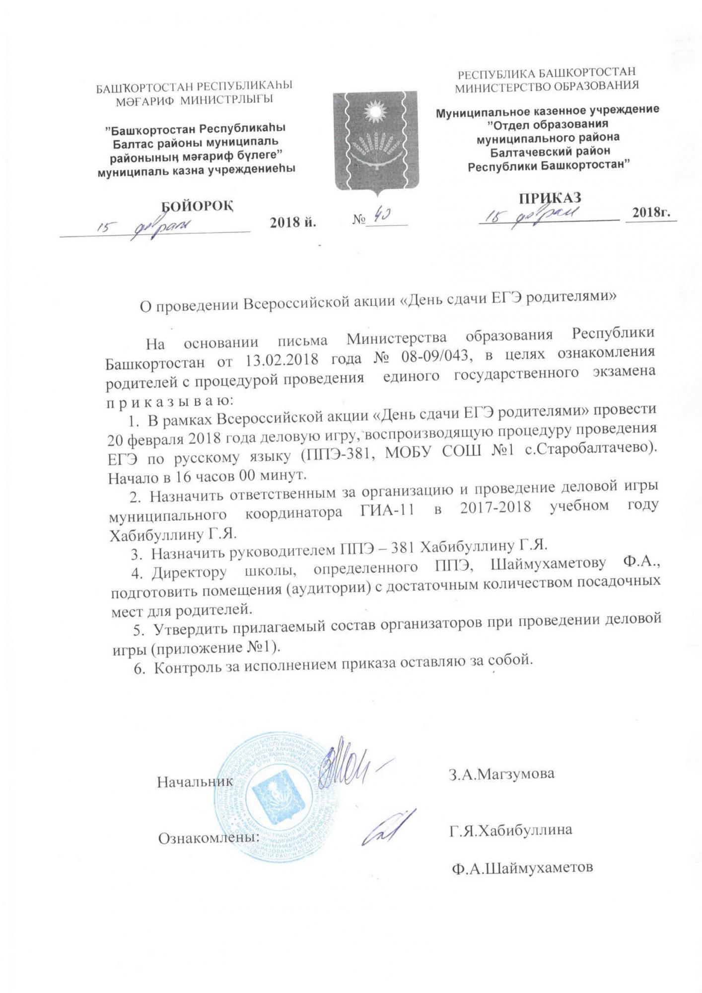 - В рамках Всероссийской акции «День сдачи ЕГЭ родителями» провести 20 февраля 2018 года деловую игру, воспроизводящую процедуру проведения ЕГЭ по русскому языку (ППЭ-381, МОБУ СОШ №1 с.Старобалтачево). Начало в 16 часов 00 минут.