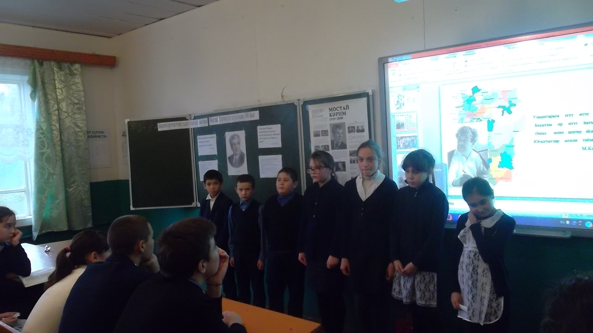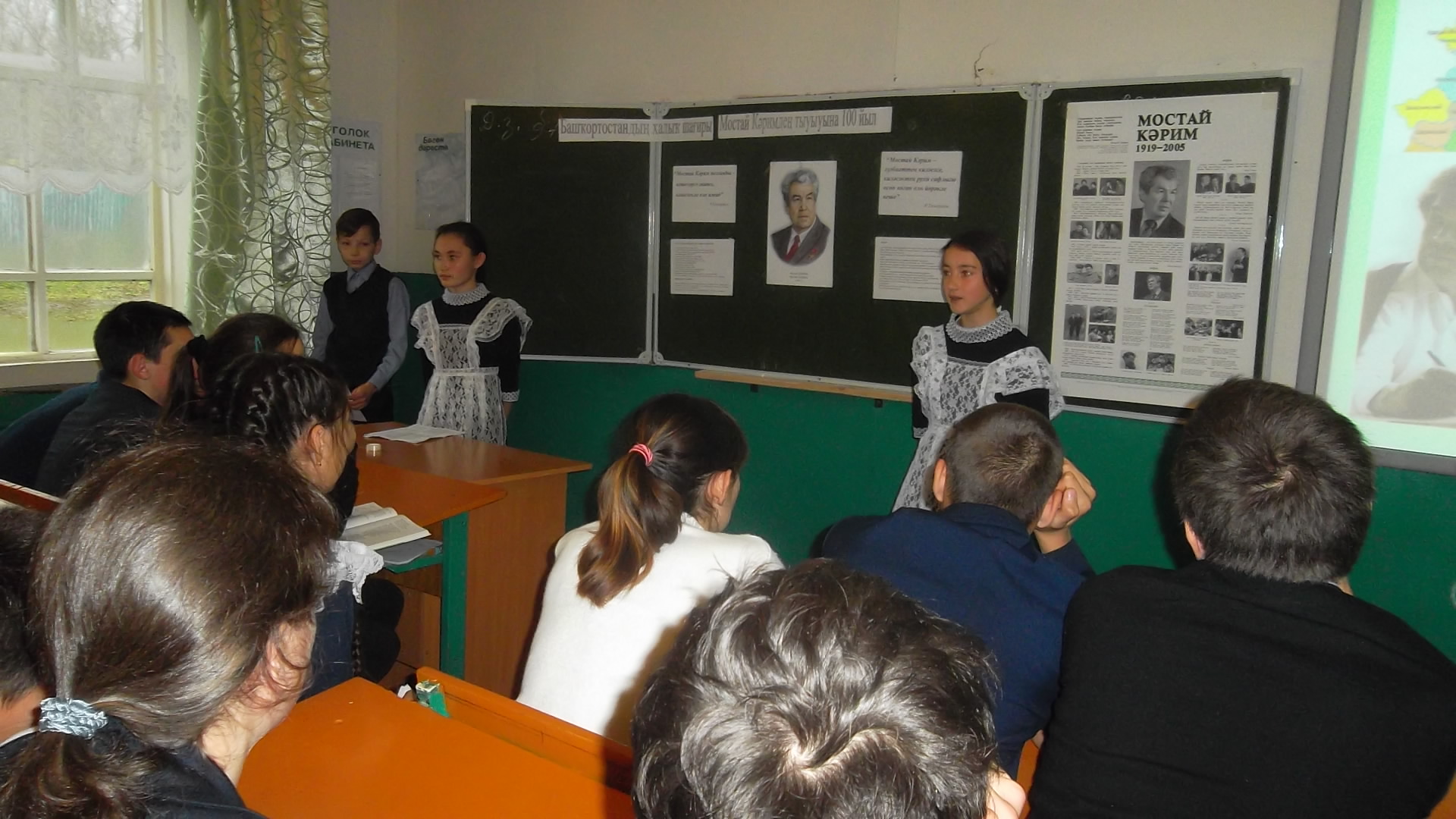 21 октября провели внеклассное мероприятие, посвященное 100-летию народного поэта Башкортостана Мустая Карима. Во время мероприятия учащиеся читали наизусть стихотворения поэта, инсценировали отрывок из повести М.Карима «Долгое-долгое детство», рассказывали жизнь и творчество поэта, пели песни на слова М.Карима. Также слушали стихи по аудиозаписи исполняемые самим автором.